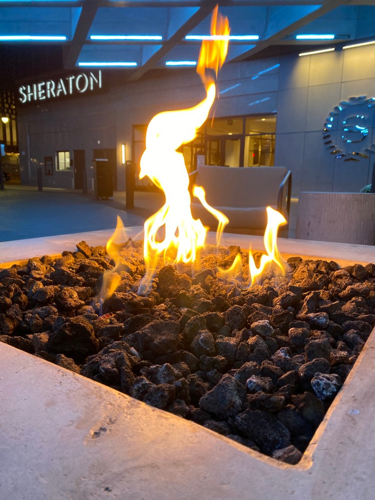 Trying to get warm outside by the fireplace in Sheraton Denver