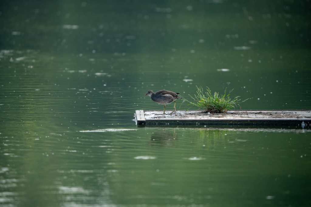 A juvenile moorhen walks across plank on the lake.