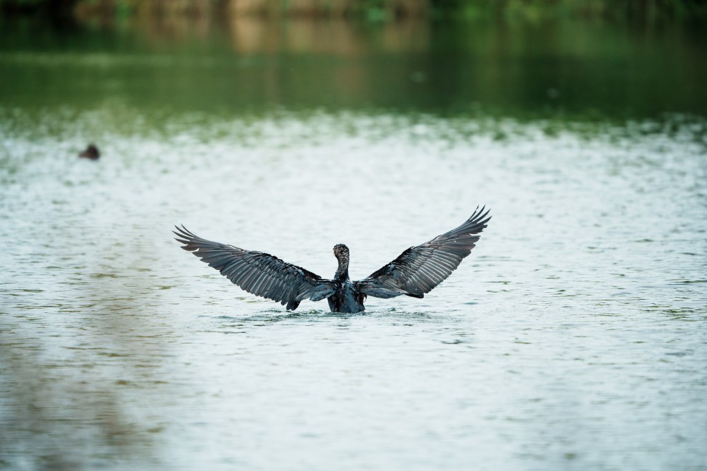 A cormorant is seen spreading it’s wings as it emerges out of water after a dive in to the lake for some food.
