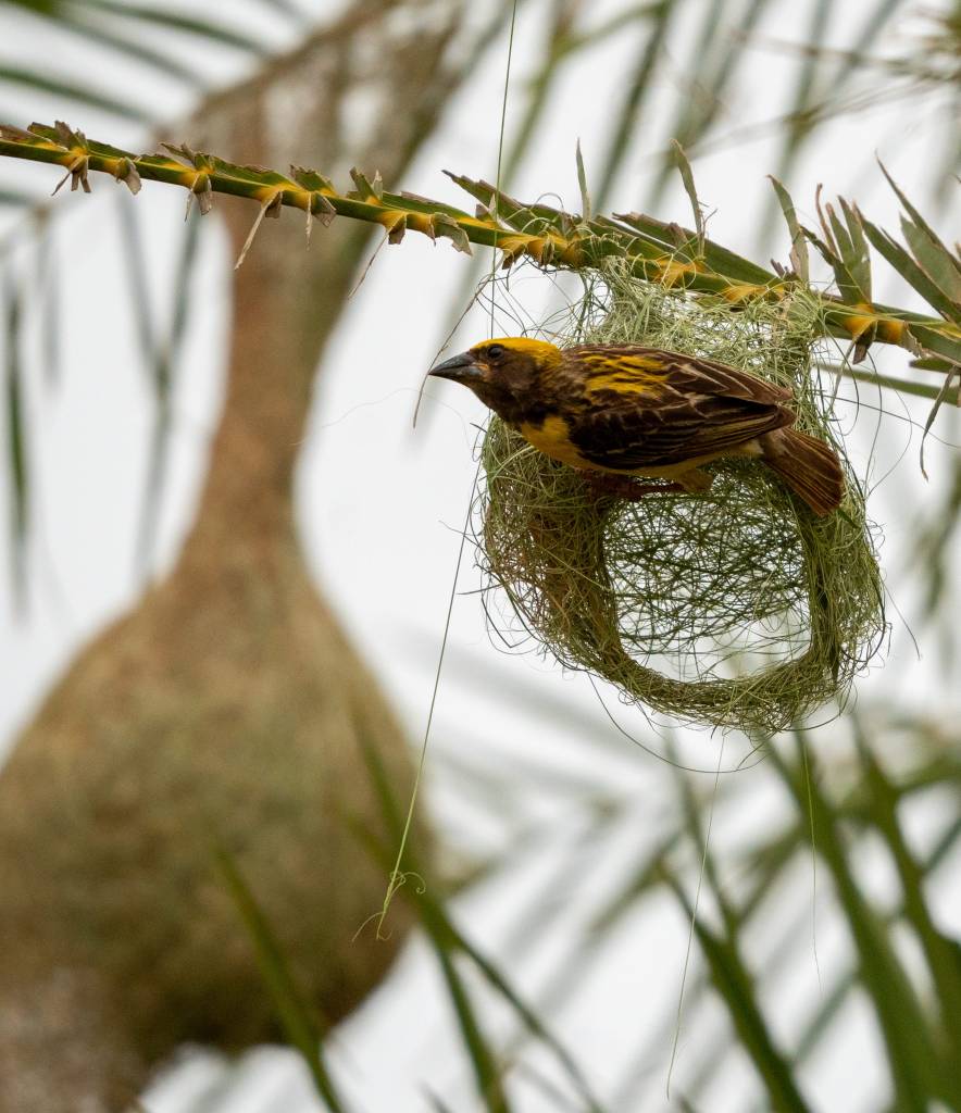 A Baya weaver is peeping out to look at something intriguing.