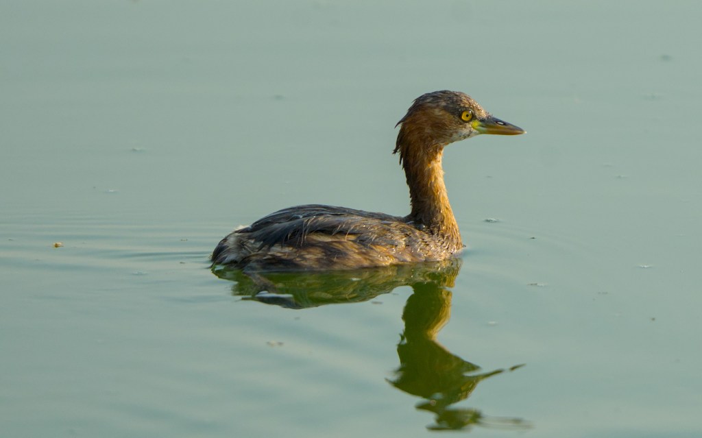 A little grebe is seen completely wet after it just popped up back to the surface after a dive into the lake.