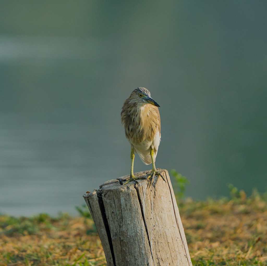 Pond heron is seen perched on a bark waiting for some fish in the pond,