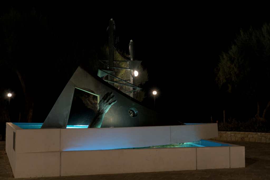 The SS Heraklion memorial is known as “The Monument of the Hand”. It features a bronze hand reaching up to the sky against a background of some angled metal shapes representing the bow of a ship sinking beneath the waves.