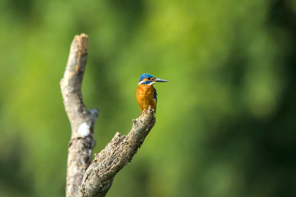 The common kingfisher is posing on broken bark here.