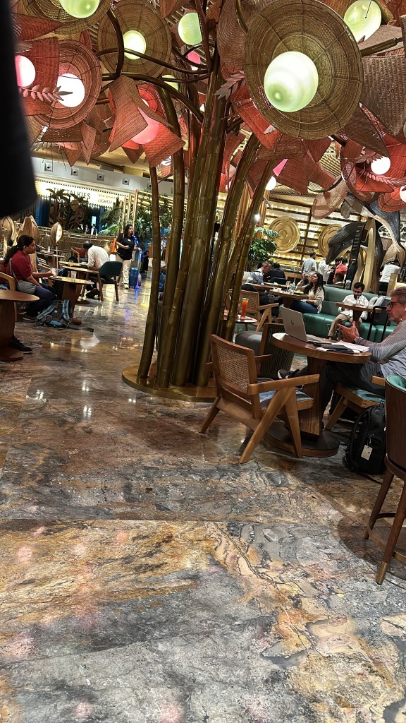 An artificial tree like structure is placed to enhance the feel of the place at the 080 lounge in BLR international Airport