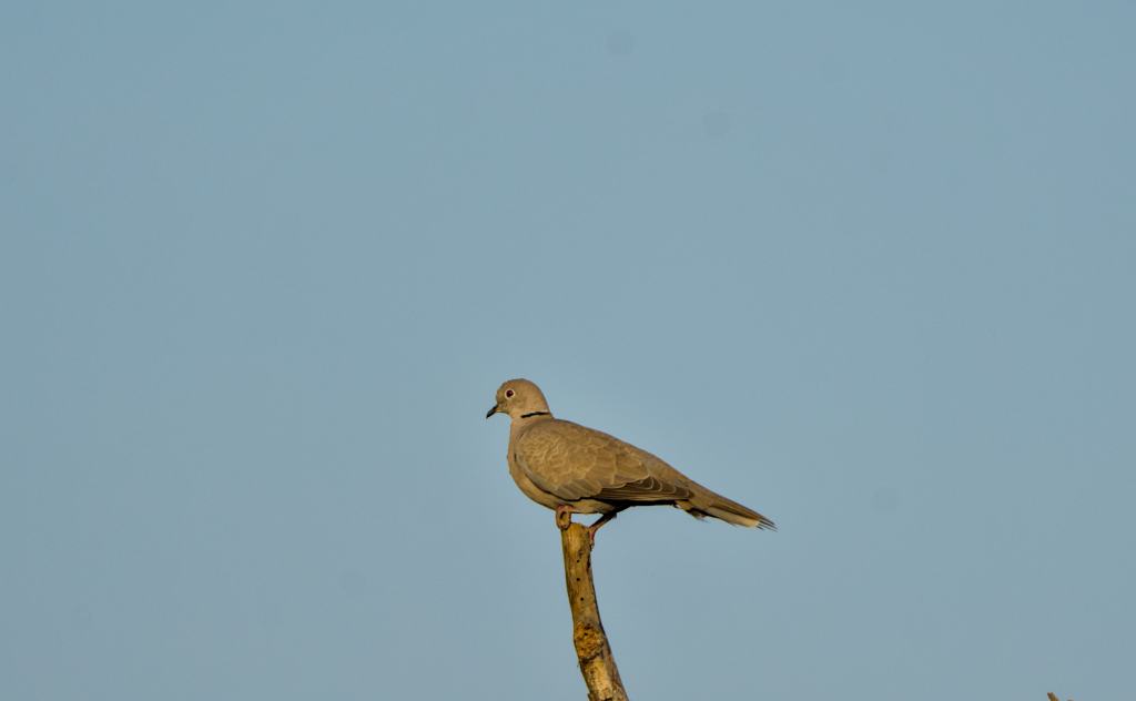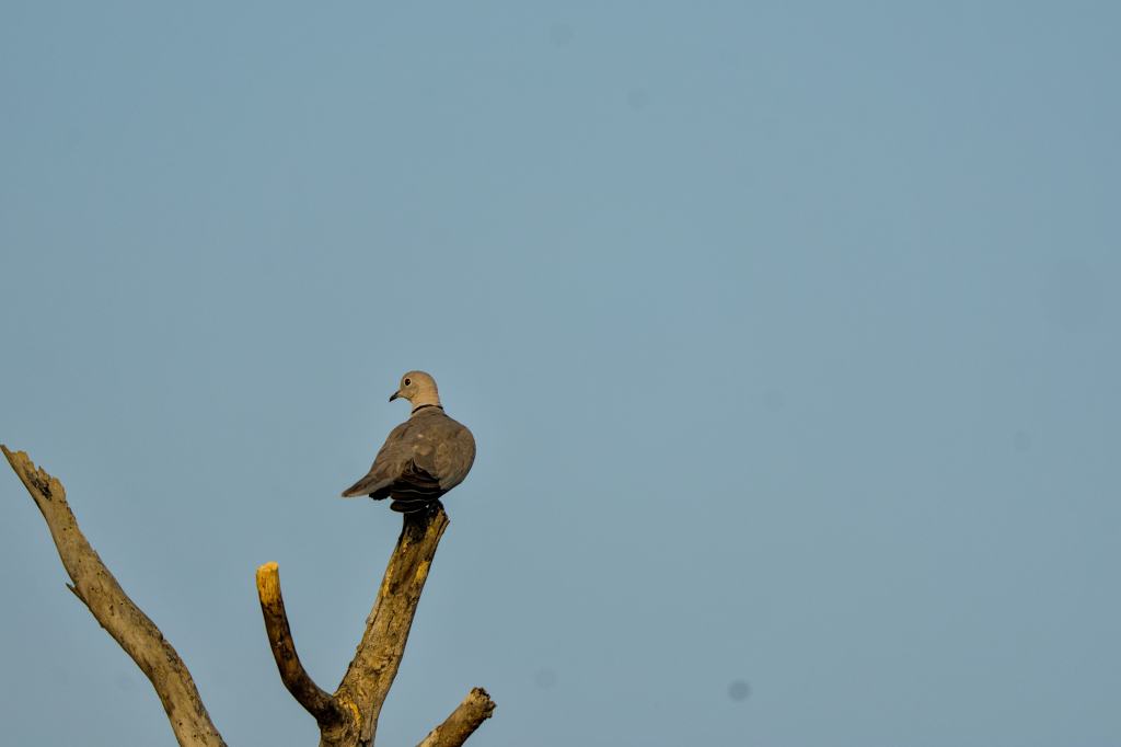 The Eurasian Collared Dove (Streptopelia decaocto) is a medium-sized dove characterized by its soft grey plumage and distinctive black “collar” at the back of its neck. Originally from the eastern Mediterranean and Asia, this species has expanded its range significantly across Europe and North America.