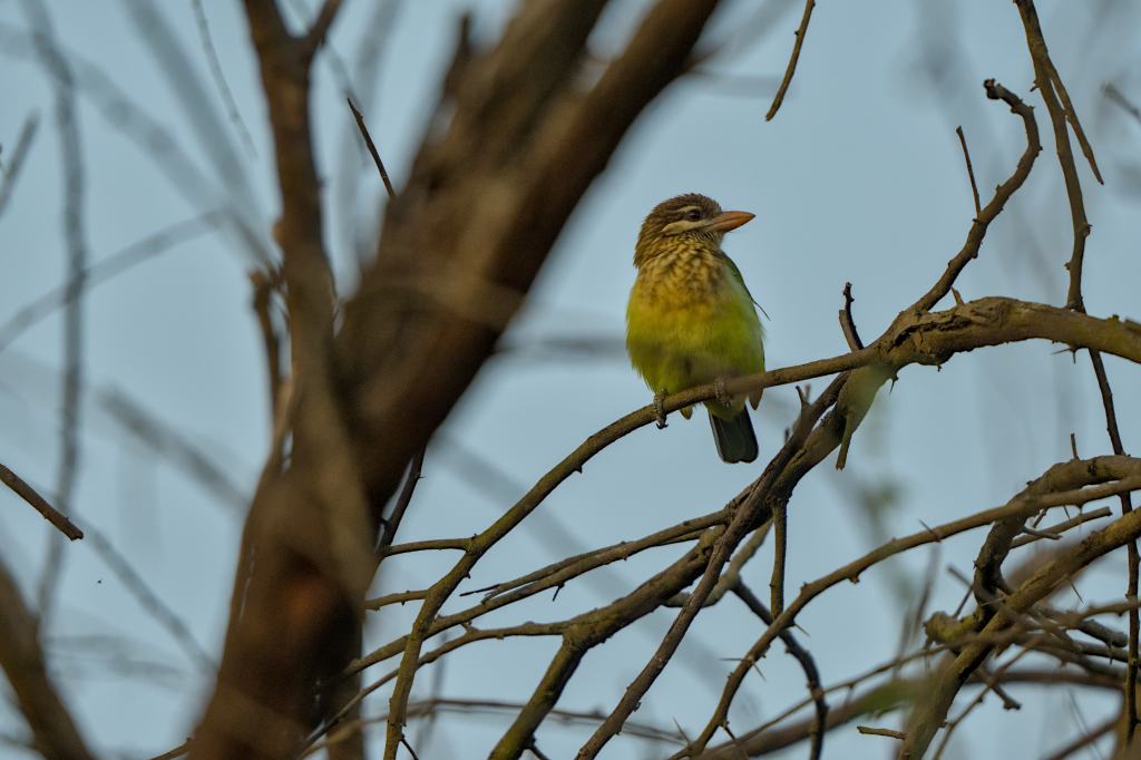 - Coloration: The White-cheeked Barbet exhibits a striking green plumage with a distinctive white cheek patch that contrasts beautifully with its coloring. It has a stout bill and a slightly curved shape.