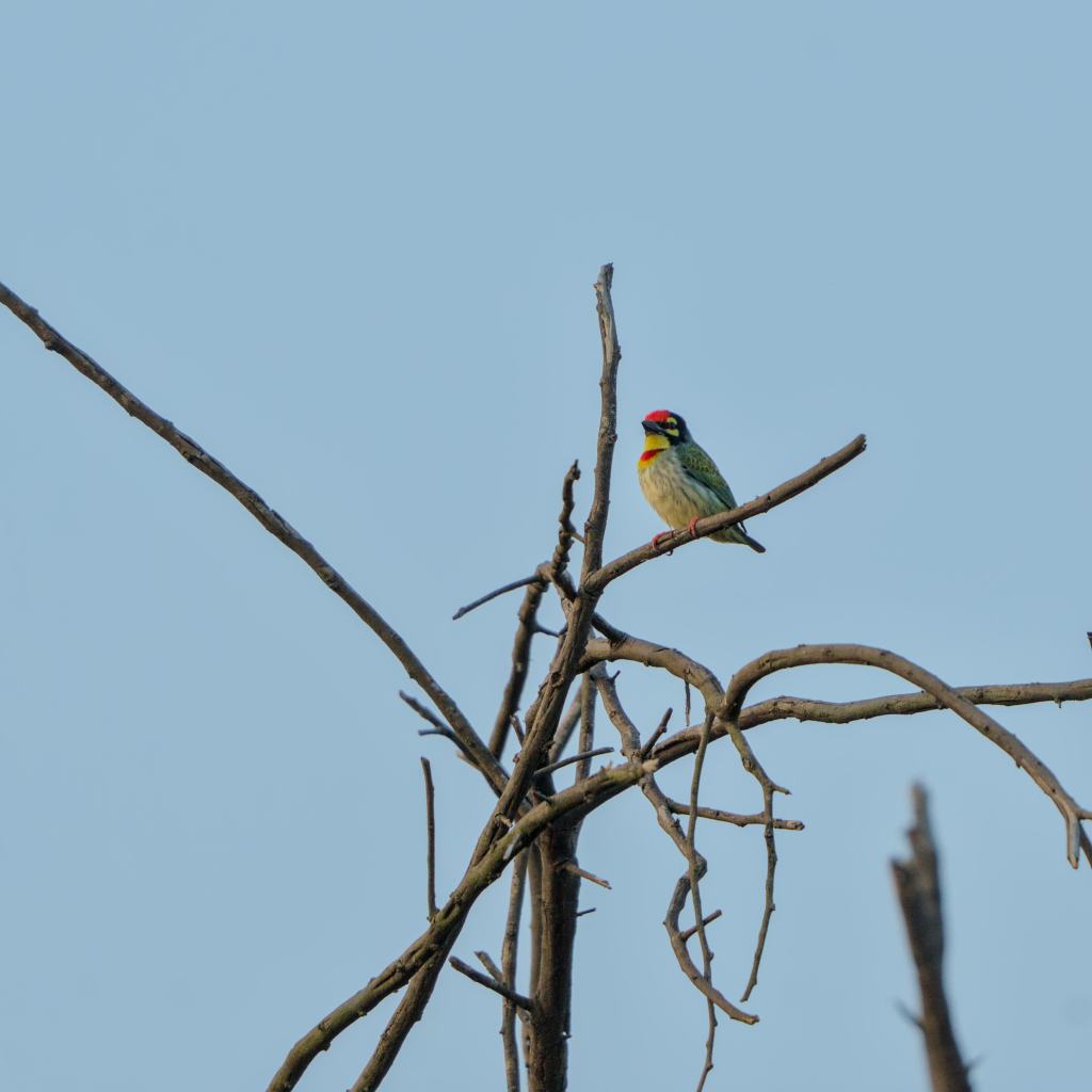 The Coppersmith Barbet is known for its loud, melodious calls, which play a significant role in its communication and mating rituals. These birds often nest in tree cavities, excavating holes to lay their eggs. Their social structure is relatively simple, usually seen in pairs or small groups.