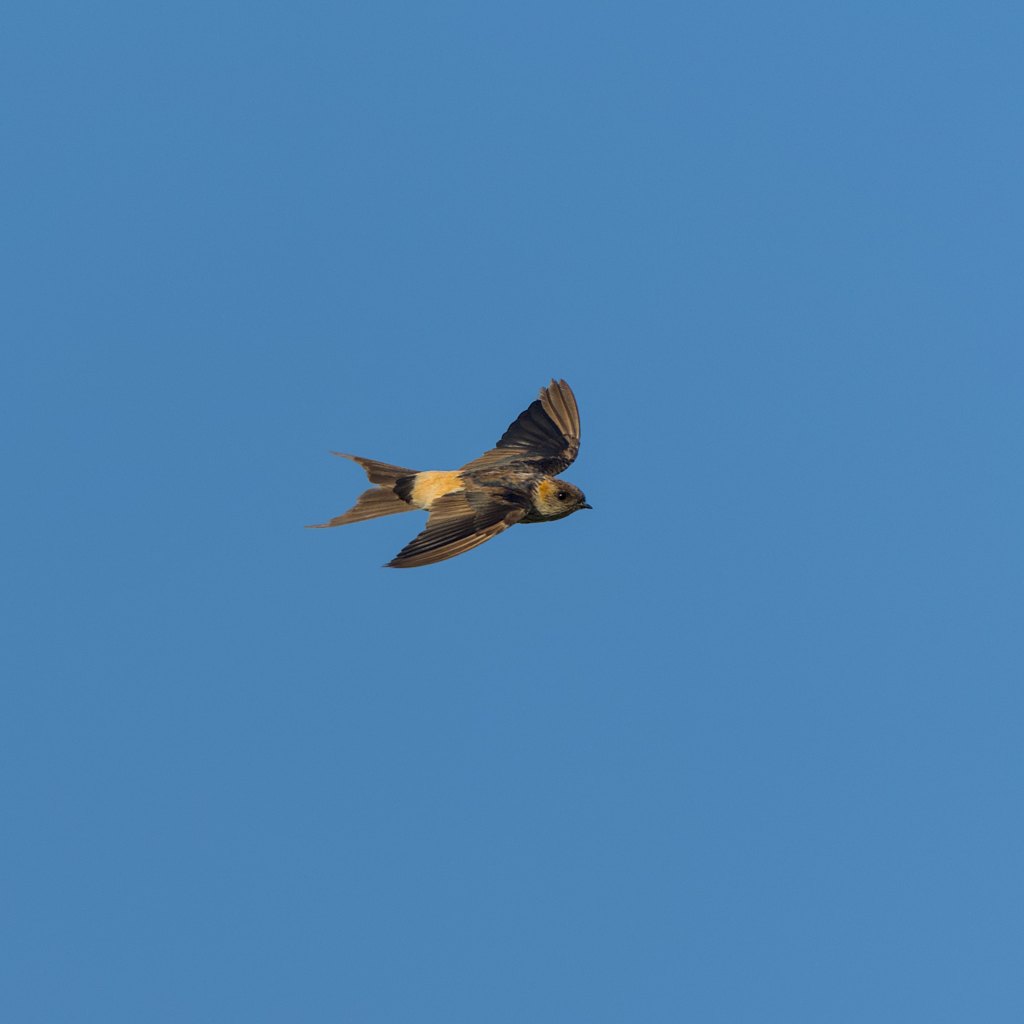 The Eastern Red-rumped Swallow (Cecropis daurica) is a small bird belonging to the swallow family. This migratory bird is characterized by its striking plumage, which includes a dark blue upper body, a rusty-orange throat, and a distinctive red rump. They are commonly found in open areas near water bodies, such as rivers and lakes, where they gather for feeding.