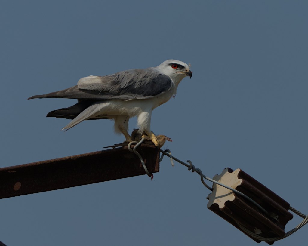 Spotted this black shouldered kite on an empty branch, and we watched it hunt a rat and bring up it up. It sat on a rat to kill it in the bushes and then took it up to the electric pole to savour it.