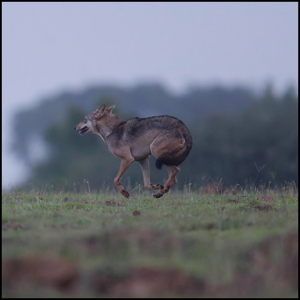 We were early, before sunrise in the grasslands for sighting smaller birds foraging the grass land and look whom we found. The interesting thing about the lone wolf running was that it was being chased by a pack of village dogs from a near by village. This chase lasted about a minute or two and no amount of manoeuvring our cars could get us any closer or stop the dogs. The wolf vanished into dense paddy field. I’m happy that camera tech and denoising has progressed leaps and bounds that these images at 10k ISO aren’t a silhouette.