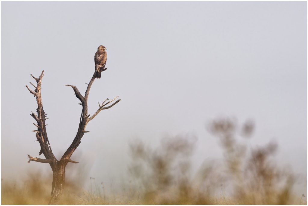An Indian spotted eagle watches over the grasslands just after sun rise.