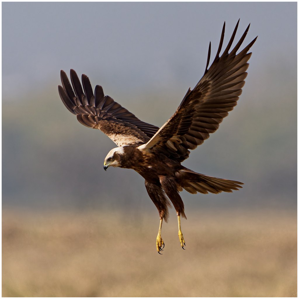 Sometimes you get lucky, when a usually shy bird shows up, poses and takes off. Here is one such shot from a burst of shots, of a western marsh harrier in flight.